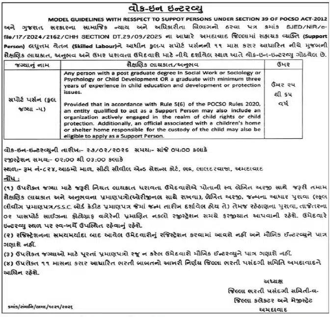 અમદાવાદ જિલ્લા કલેક્ટર કચેરી હેઠળ POCSO એક્ટ-2012 ની કલમ 39 ના અમલીકરણ માટે સપોર્ટ પર્સનની નિમણૂક કરવાની જાહેરાત કરવામાં આવી છે. આ ભરતીનો મુખ્ય ઉદ્દેશ્ય શોષિત બાળકોને કાયદાકીય અને મનોવૈજ્ઞાનિક સહાય પૂરી પાડવાનો છે. આ જગ્યાઓ 11 માસના કરાર પર આધારિત છે, જે કામગીરીના આધારે આગળ લંબાવી શકાય છે. ઉમેદવારોએ કોઈ ઓનલાઈન ફોર્મ ભરવાનું નથી, પરંતુ સીધા જ નિયત સમયે ઇન્ટરવ્યુના સ્થળે હાજર રહેવાનું રહેશે.