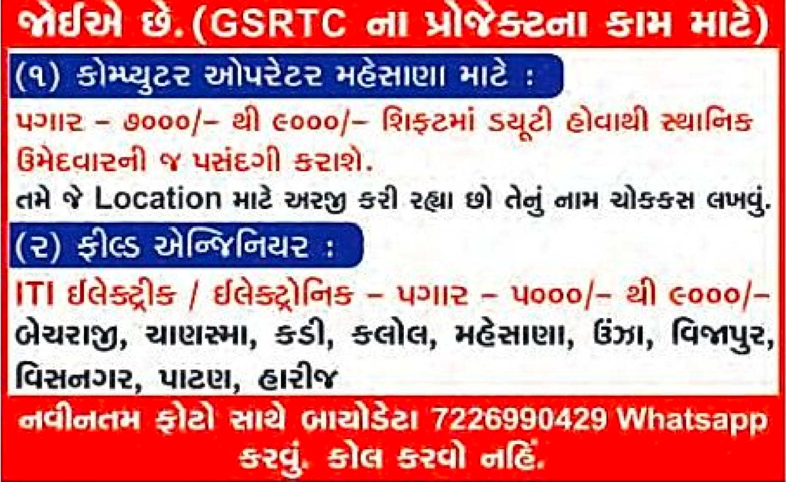 આ ભરતી GSRTC ના “પ્રોજેક્ટના કામ માટે” છે, જેનો અર્થ એ હોઈ શકે કે આ કાયમી સરકારી નોકરી નથી પરંતુ કોન્ટ્રાક્ટ અથવા પ્રોજેક્ટ બેઝ પરની પ્રાઈવેટ નોકરી છે.
