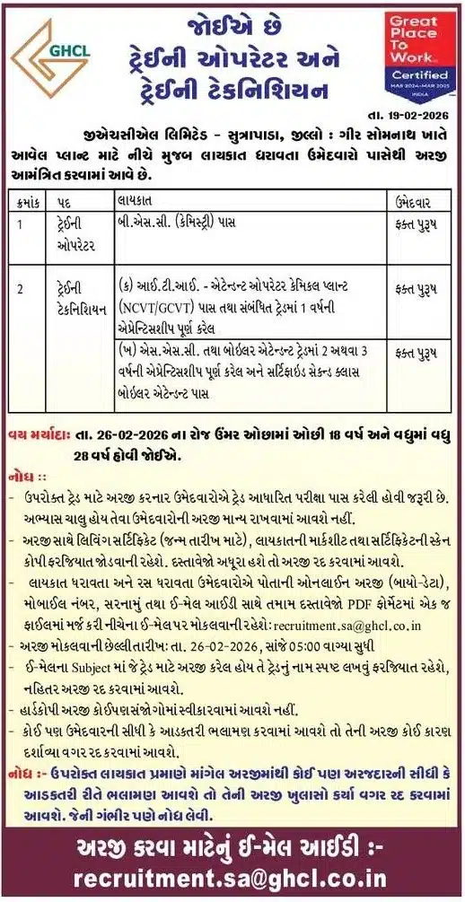 GHCL લિમિટેડ એ કેમિકલ સેક્ટરમાં નામ ધરાવતી કંપની છે. હાલમાં તેમના સુત્રાપાડા સ્થિત પ્લાન્ટ માટે નવી ભરતી બહાર પાડવામાં આવી છે. આ ભરતીનો મુખ્ય હેતુ ટેકનિકલ ક્ષેત્રે કુશળ ઉમેદવારોને તૈયાર કરવાનો છે. કંપનીમાં ‘Great Place To Work’ નું સર્ટિફિકેશન હોવાથી અહીં કામ કરવાનું વાતાવરણ ખૂબ જ પ્રોફેશનલ અને શિસ્તબદ્ધ છે. ઉમેદવારોને અહીં લેટેસ્ટ ટેકનોલોજી અને મશીનરી સાથે કામ કરવાનો સીધો અનુભવ મળશે.