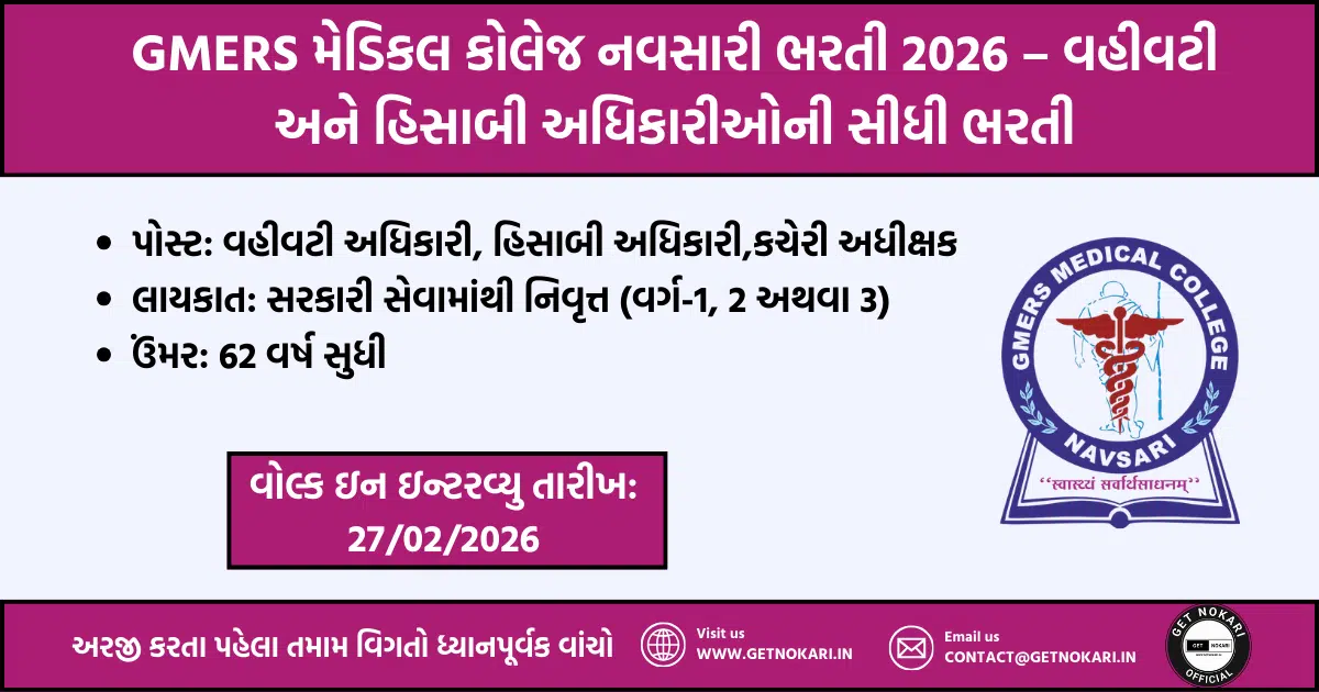 નમસ્કાર મિત્રો, જો તમે સરકારી સેવામાંથી નિવૃત્ત થયા છો અને હજુ પણ તમારી વહીવટી કુશળતાનો ઉપયોગ કરીને ગૌરવપૂર્ણ કારકિર્દી ચાલુ રાખવા માંગો છો, તો તમારા માટે એક સુવર્ણ તક આવી ગઈ છે. GMERS મેડિકલ કોલેજ, નવસારી દ્વારા વિવિધ વહીવટી પોસ્ટ્સ માટે ભરતીની જાહેરાત કરવામાં આવી છે. આ ભરતી ખાસ કરીને અનુભવી નિવૃત્ત કર્મચારીઓ માટે છે જેઓ મેડિકલ એજ્યુકેશન ક્ષેત્રે પોતાનું યોગદાન આપવા માંગે છે.