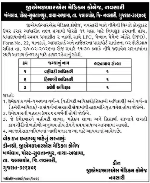 નવસારી જેવી શાંત અને વિકસિત જગ્યાએ મેડિકલ કોલેજમાં કામ કરવું એ માત્ર નોકરી નથી, પણ સમાજ સેવા સાથે જોડાયેલું એક સન્માનજનક કાર્ય છે. જો તમે લાયકાત ધરાવતા હોવ, તો આ વોક-ઈન-ઇન્ટરવ્યુનો લાભ લેવાનું ચૂકશો નહીં.