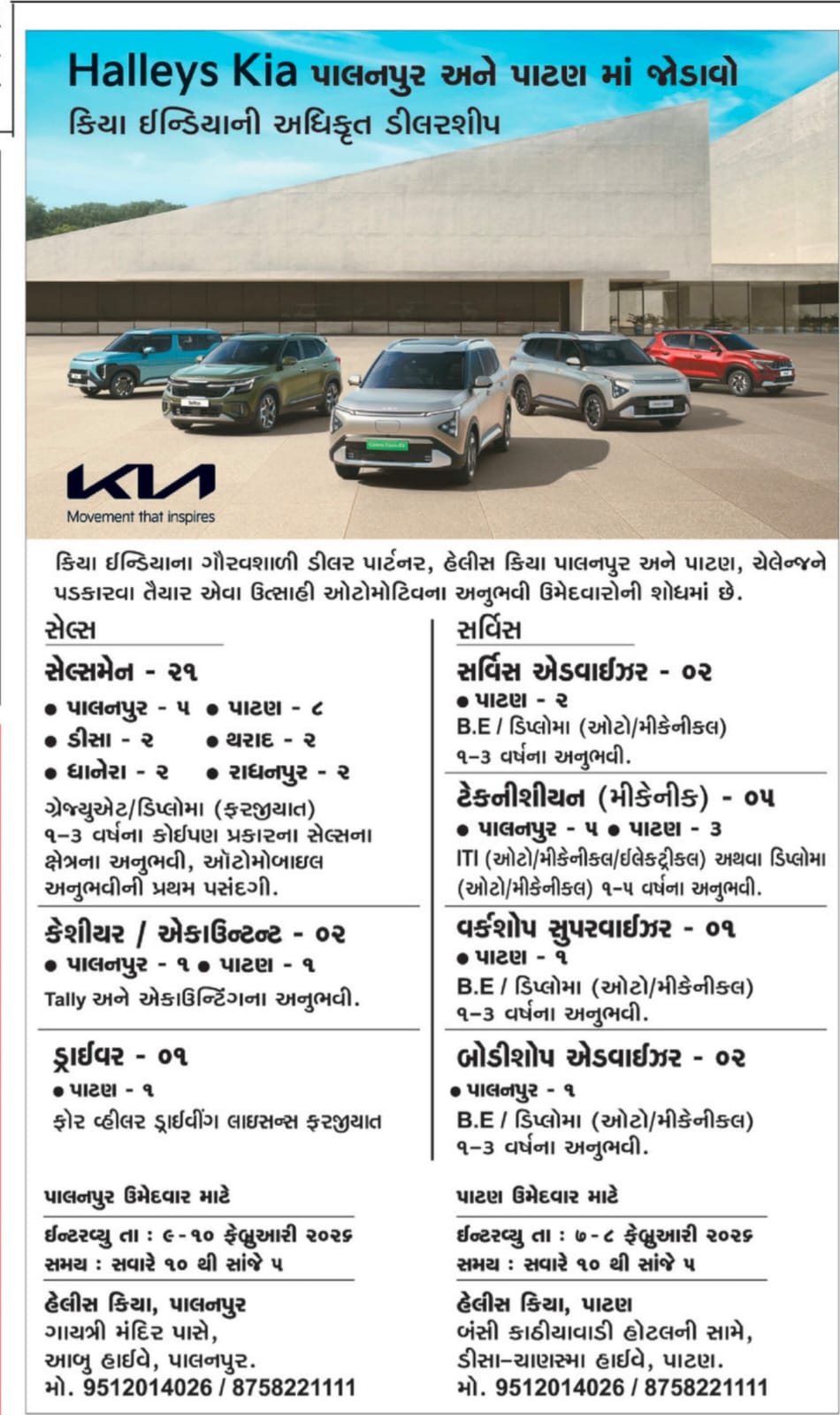 જો તમે ઉત્તર ગુજરાતમાં રહો છો અને ઓટોમોબાઈલ ક્ષેત્રની જાણીતી બ્રાન્ડ ‘કિયા’ (Kia) સાથે જોડાઈને તમારી કારકિર્દી બનાવવા માંગો છો, તો તમારા માટે એક શાનદાર તક આવી ગઈ છે. હેલીસ કિયા (Halleys Kia) દ્વારા પાલનપુર અને પાટણ લોકેશન માટે વિવિધ હોદ્દાઓ પર ઉત્સાહી ઉમેદવારોની શોધ કરવામાં આવી રહી છે. આ ભરતી ખાસ કરીને એવા યુવાનો માટે છે જેઓ ઓટોમોટિવ સેક્ટરમાં અનુભવ ધરાવે છે અથવા આ ક્ષેત્રમાં આગળ વધવા માંગે છે.