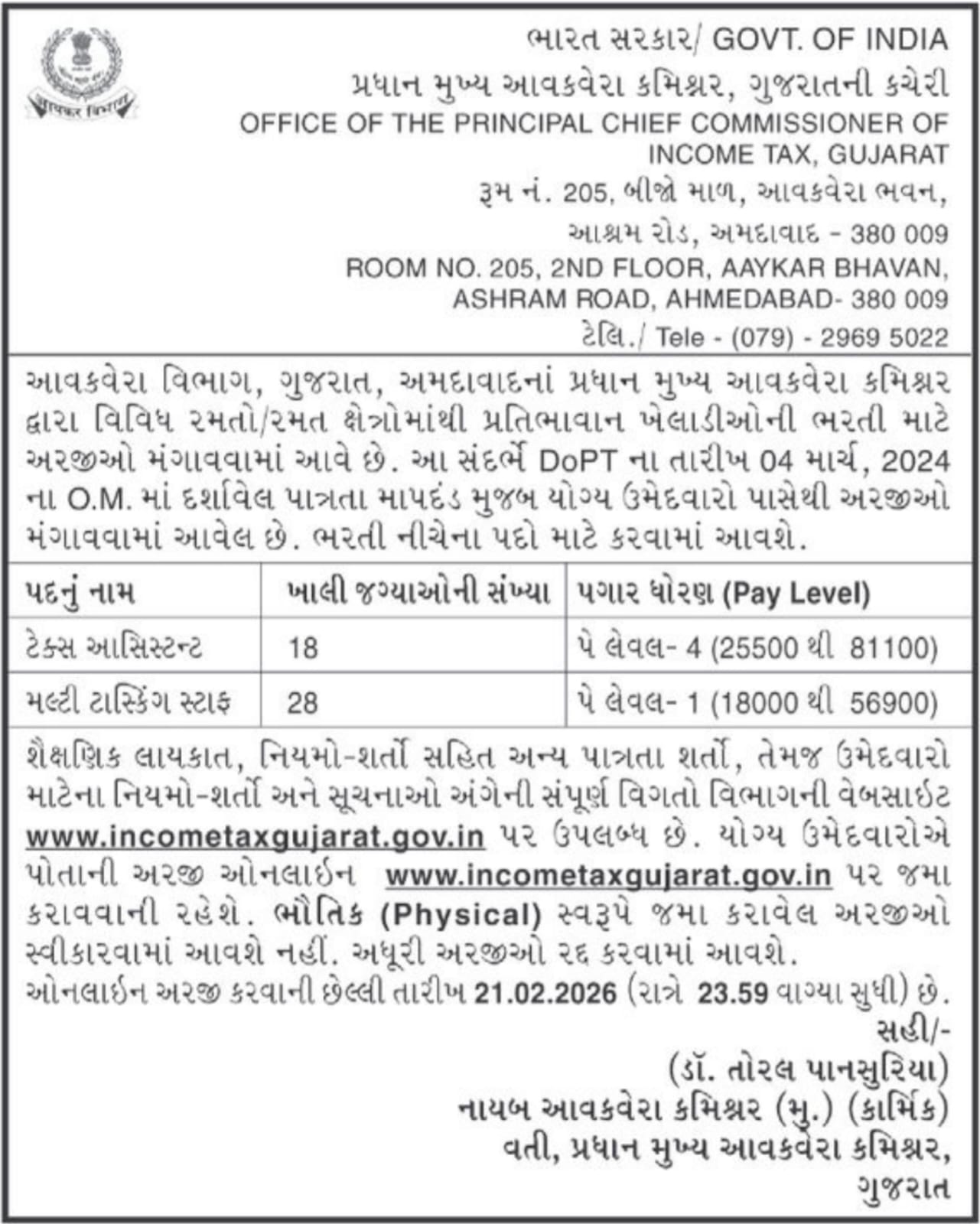 ભારત સરકારના આવકવેરા વિભાગ, ગુજરાત દ્વારા રમતગમત ક્ષેત્રે વિશિષ્ટ સિદ્ધિ ધરાવતા પ્રતિભાશાળી ખેલાડીઓ માટે સરકારી નોકરી મેળવવાની શાનદાર તક બહાર પાડવામાં આવી છે. પ્રધાન મુખ્ય આવકવેરા કમિશનરની કચેરી, અમદાવાદ દ્વારા સ્પોર્ટ્સ કોટા હેઠળ ટેક્સ આસિસ્ટન્ટ અને મલ્ટી ટાસ્કિંગ સ્ટાફ (MTS) ના પદો પર ભરતી માટે સત્તાવાર નોટિફિકેશન બહાર પાડવામાં આવ્યું છે.