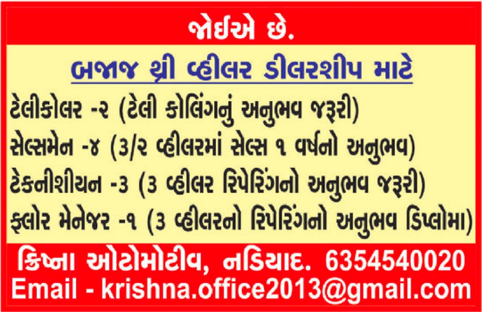 નડિયાદ સ્થિત ક્રિષ્ના ઓટોમોટીવ (Krishna Automotive) દ્વારા બજાજ થ્રી વ્હીલર ડીલરશીપ માટે વિવિધ સ્ટાફની તાત્કાલિક ભરતી જાહેર કરવામાં આવી છે. જો તમે ઓટોમોબાઈલ ક્ષેત્રે કારકિર્દી બનાવવા માંગતા હોવ, તો આ એક ઉત્તમ તક છે.