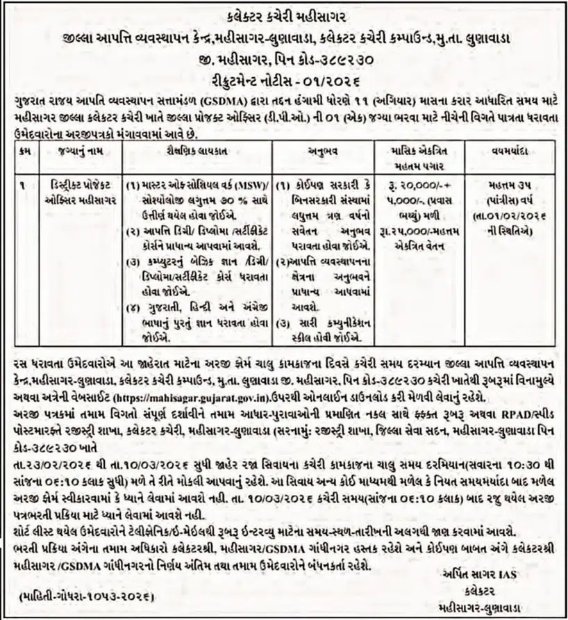 મહીસાગર જિલ્લામાં સરકારી ક્ષેત્રે કારકિર્દી બનાવવા ઈચ્છતા અને સામાજિક કાર્યમાં રસ ધરાવતા ઉમેદવારો માટે એક સુવર્ણ તક આવી ગઈ છે. મહીસાગર-લુણાવાડા કલેક્ટર કચેરી દ્વારા ડિસ્ટ્રિક્ટ પ્રોજેક્ટ ઓફિસર (DPO) ની મહત્વની પોસ્ટ માટે ભરતીની જાહેરાત કરવામાં આવી છે. આ ભરતી ખાસ કરીને આપત્તિ વ્યવસ્થાપન (Disaster Management) ક્ષેત્રે કામ કરવા માંગતા યુવાનો માટે ઉત્તમ છે.