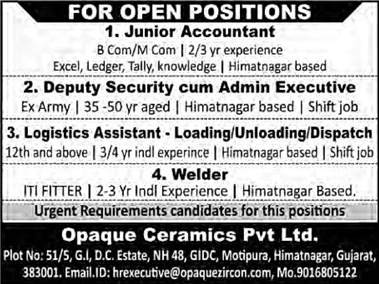 હિંમતનગર સ્થિત જાણીતી કંપની Opaque Ceramics Pvt Ltd. દ્વારા વિવિધ વહીવટી અને ટેકનિકલ પોસ્ટ માટે તાત્કાલિક ભરતી જાહેર કરવામાં આવી છે. જો તમે યોગ્ય લાયકાત ધરાવતા હોવ, તો નીચે મુજબની વિગતો તપાસીને અરજી કરી શકો છો.