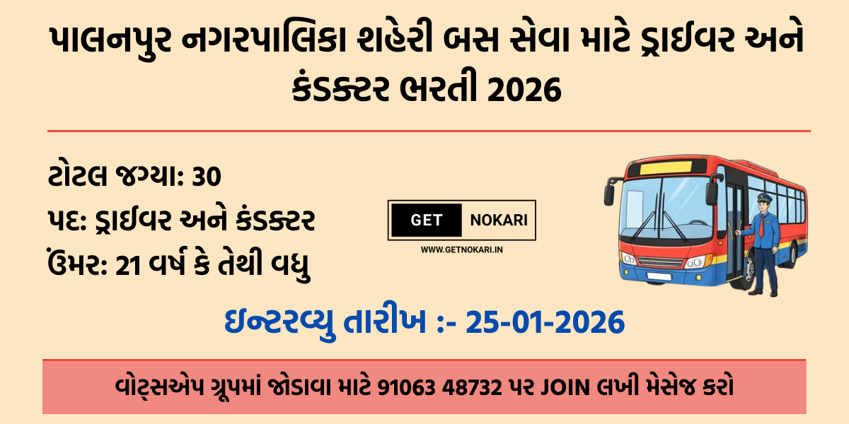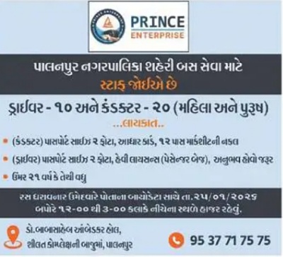 ⇒ આ ભરતી પ્રિન્સ એન્ટરપ્રાઇઝ (Prince Enterprise) દ્વારા પાલનપુર નગરપાલિકા શહેરી બસ સેવા માટે કરવામાં આવી રહી છે.