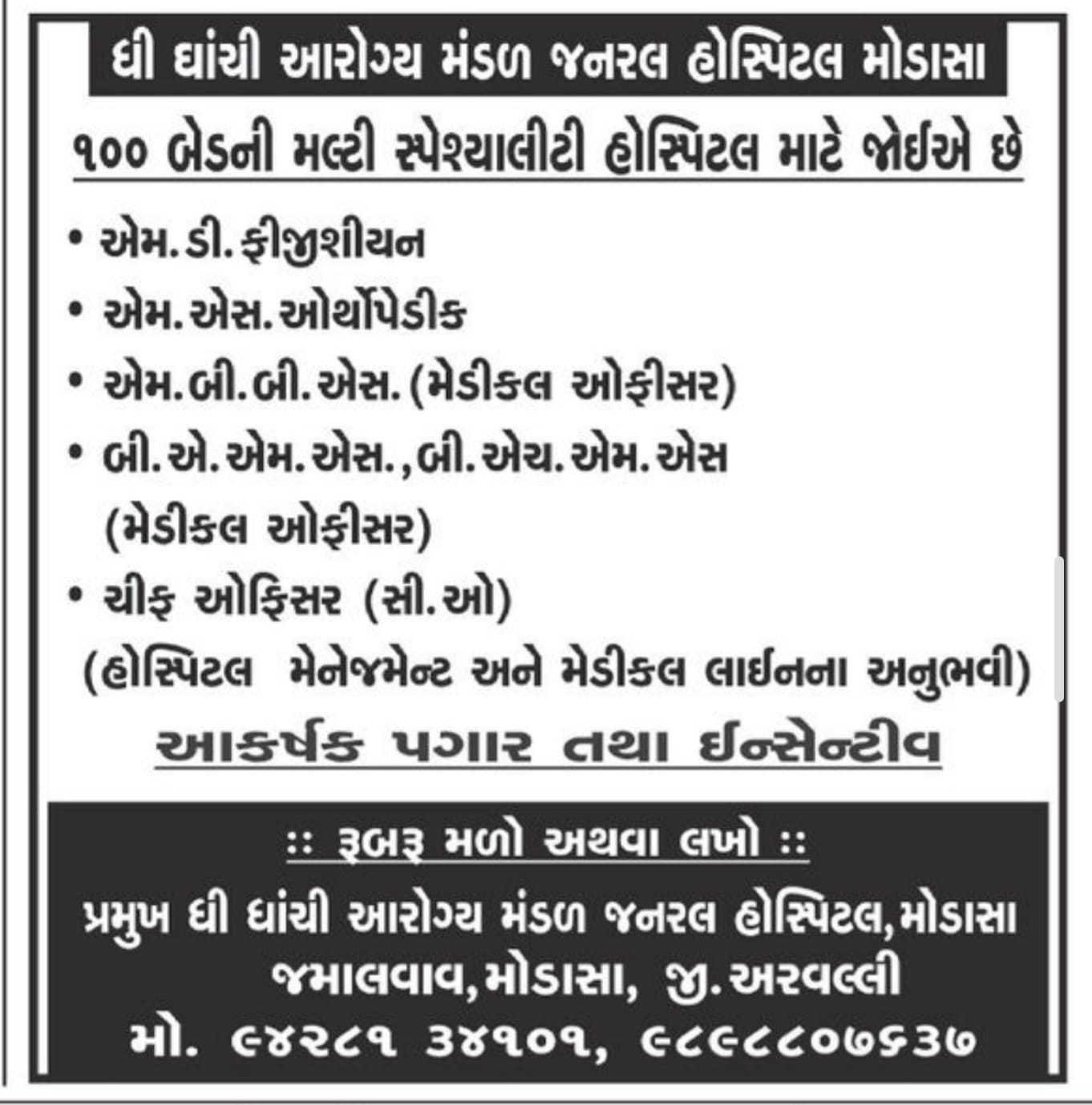 100 Bed Multispeciality Hospital માટે ડોક્ટર અને મેડિકલ સ્ટાફની જરૂર