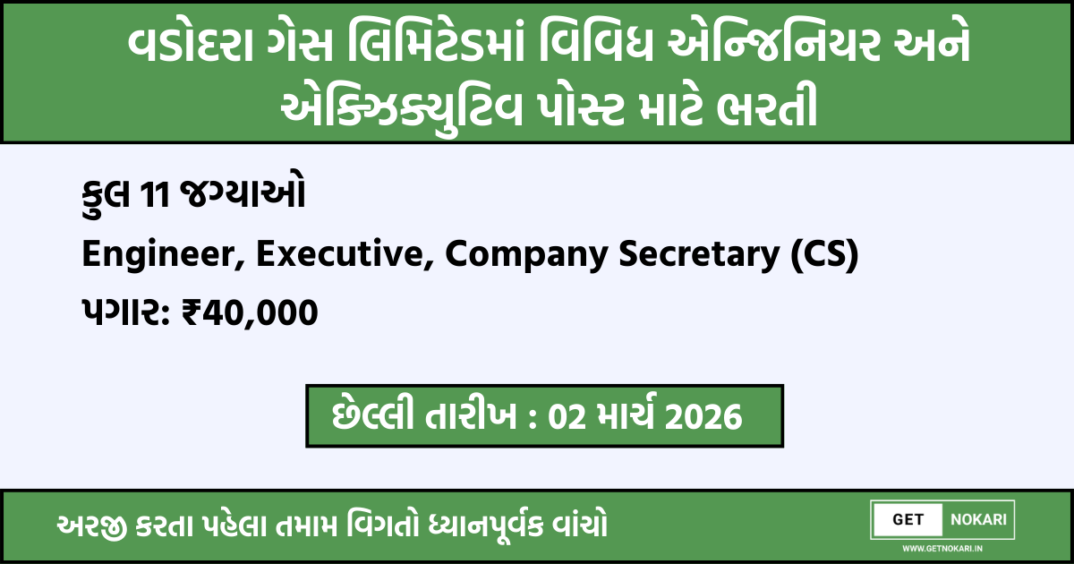 વડોદરા ગેસ લિમિટેડ (VGL) એ ગેસ વિતરણ ક્ષેત્રે કાર્યરત વડોદરાની એક મહત્વની કંપની છે. હાલમાં કંપનીમાં એન્જિનિયરિંગ અને એડમિનિસ્ટ્રેશન વિભાગમાં કુલ 11 જેટલી જગ્યાઓ ખાલી છે. આ ભરતી ફિક્સ્ડ ટર્મ કોન્ટ્રાક્ટના ધોરણે કરવામાં આવી રહી છે, જેમાં શરૂઆતમાં 3 વર્ષનો સમયગાળો રહેશે અને કામગીરીના આધારે તેને 5 વર્ષ સુધી લંબાવી શકાય છે. જો તમે એન્જિનિયરિંગ અથવા ગ્રેજ્યુએશન પૂરું કર્યું હોય અને 1-2 વર્ષનો અનુભવ ધરાવતા હોવ, તો આ એક ઉત્તમ તક છે.