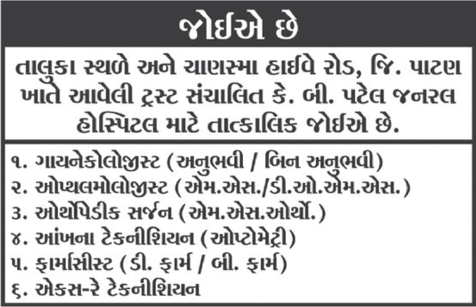 કે. બી. પટેલ જનરલ હોસ્પિટલ, ચાણસ્મા વિવિધ પોસ્ટ માટે ભરતી