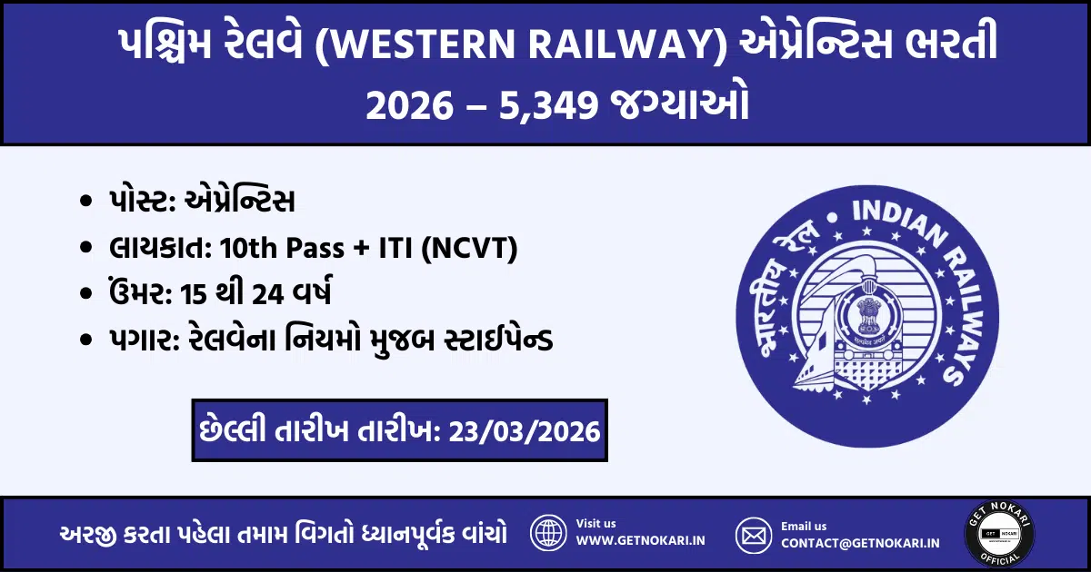 ભારતીય રેલવેમાં કારકિર્દી બનાવવા ઈચ્છતા અને ITI પાસ કરેલ તમામ યુવાનો માટે પશ્ચિમ રેલવે (Western Railway) દ્વારા એક ખૂબ જ મોટી અને મહત્વની ભરતીની જાહેરાત કરવામાં આવી છે. આ ભરતી ખાસ કરીને એપ્રેન્ટિસની તાલીમ માટે છે, જેમાં 5,300 થી પણ વધુ ખાલી જગ્યાઓ ભરવામાં આવનાર છે.