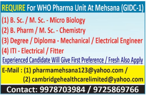 WHO ફાર્મા યુનિટ મહેસાણા ભરતી 2026: માઇક્રોબાયોલોજી, કેમિસ્ટ્રી અને એન્જિનિયરિંગ પદો માટે ભરતી