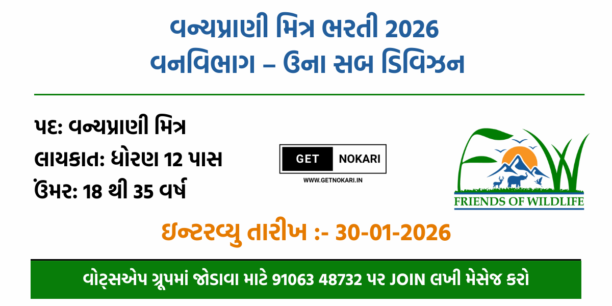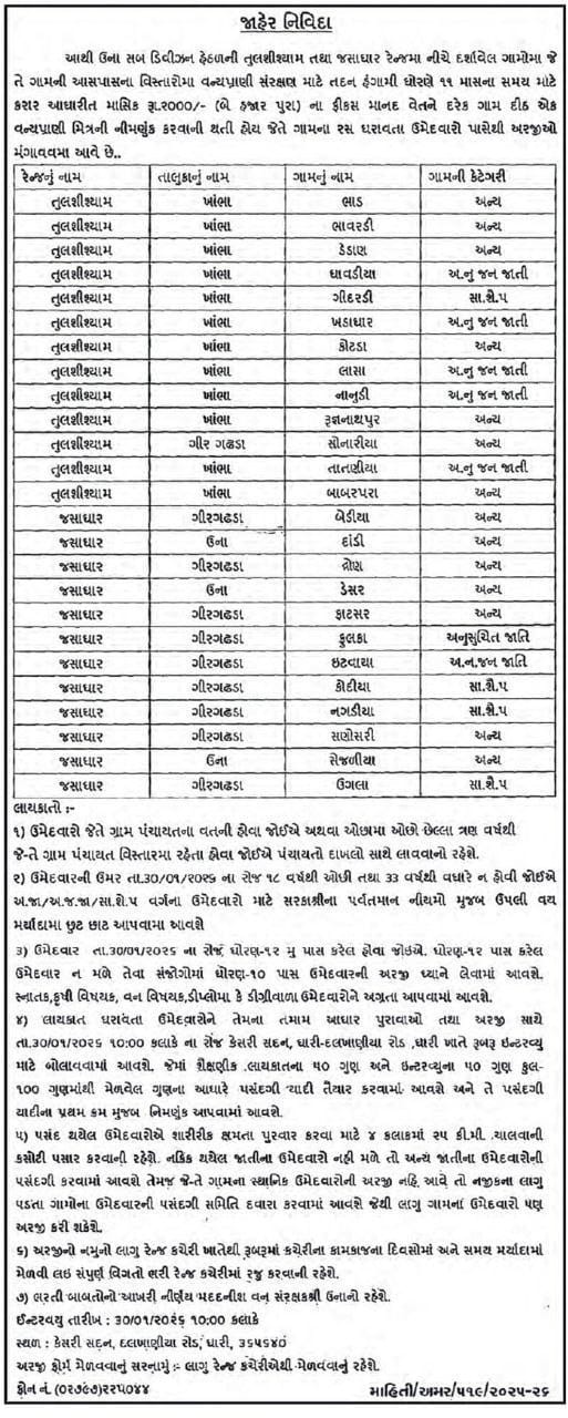 ઉના સબ-ડિવિઝન હેઠળ આવેલા તુલશીશ્યામ અને જસાદર રેન્જ ના વિવિધ ગ્રામ પંચાયત વિસ્તારોમાં વન્યપ્રાણી મિત્ર તરીકે 11 માસના કરાર આધારિત (હંગામી) ધોરણે ભરતી કરવાની જાહેર જાહેરાત બહાર પાડવામાં આવી છે. આ ભરતી વન વિભાગ હેઠળ વન્યજીવોના સંરક્ષણ, માનવ-વન્યજીવ સંઘર્ષ નિયંત્રણ તથા વન સુરક્ષા કાર્ય માટે કરવામાં આવી રહી છે